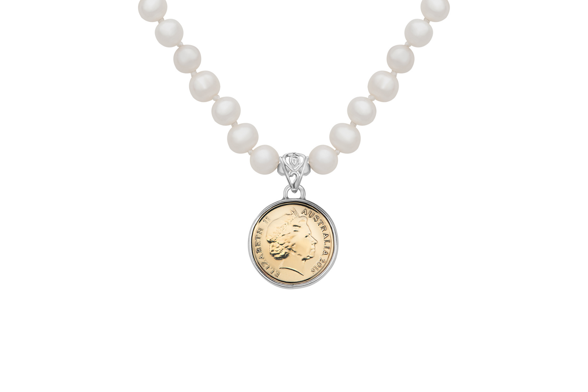 This season’s hottest accessory is all about coins! Featuring a handcrafted Queen Elizabeth II coin, this Julie Miles necklace pairs it beautifully with lustrous freshwater pearls on delicate silk. It rests perfectly just below the collarbone and fastens with a custom sterling silver clasp for a touch of charm.